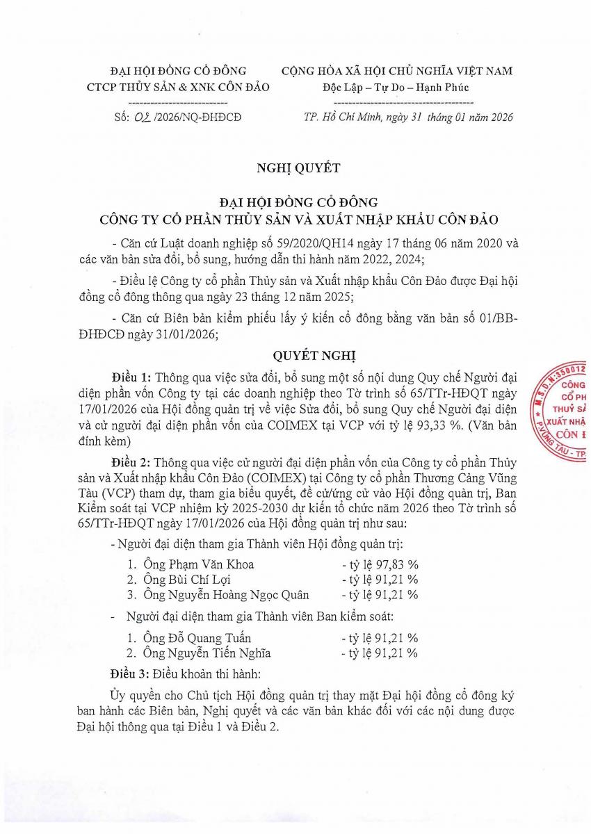 - Nghị quyết số 02.NQ-ĐHĐCĐ ngày 31.01.2026 về việc lấy ý kiến cổ đông bằng văn bản